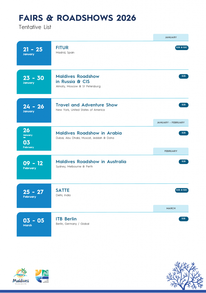 We are always on the road! Visit Maldives Corporation takes part in several fairs around the world every year. Below is a calendar of events planned for the year 2026.