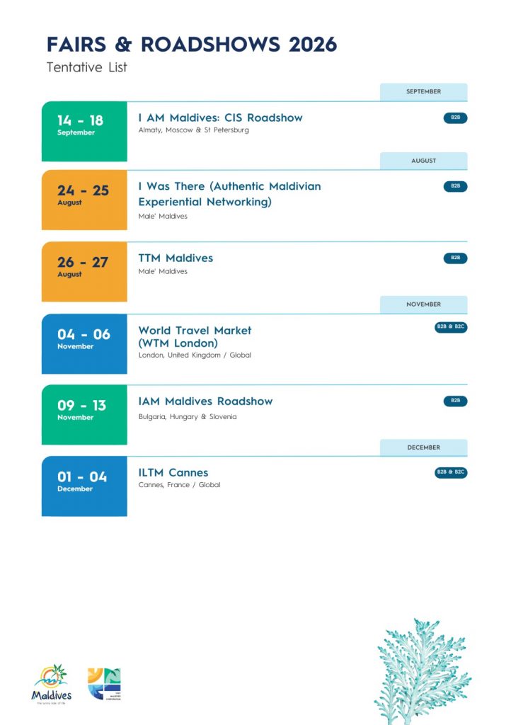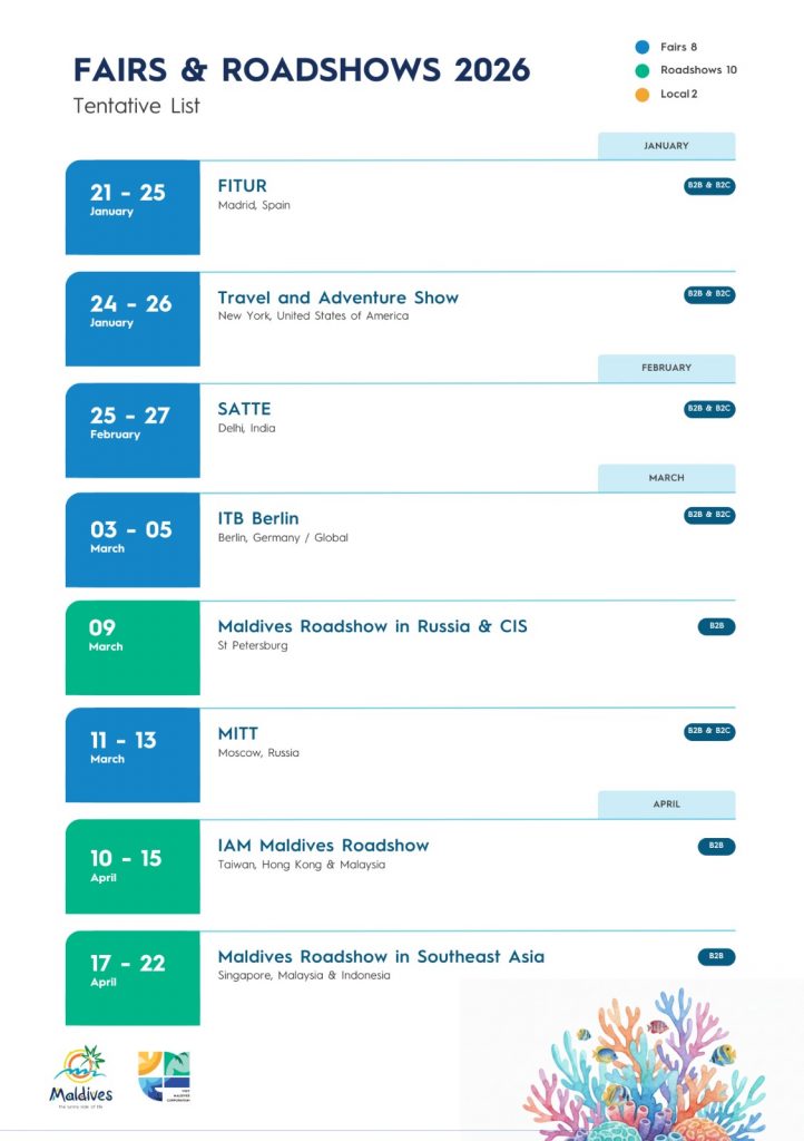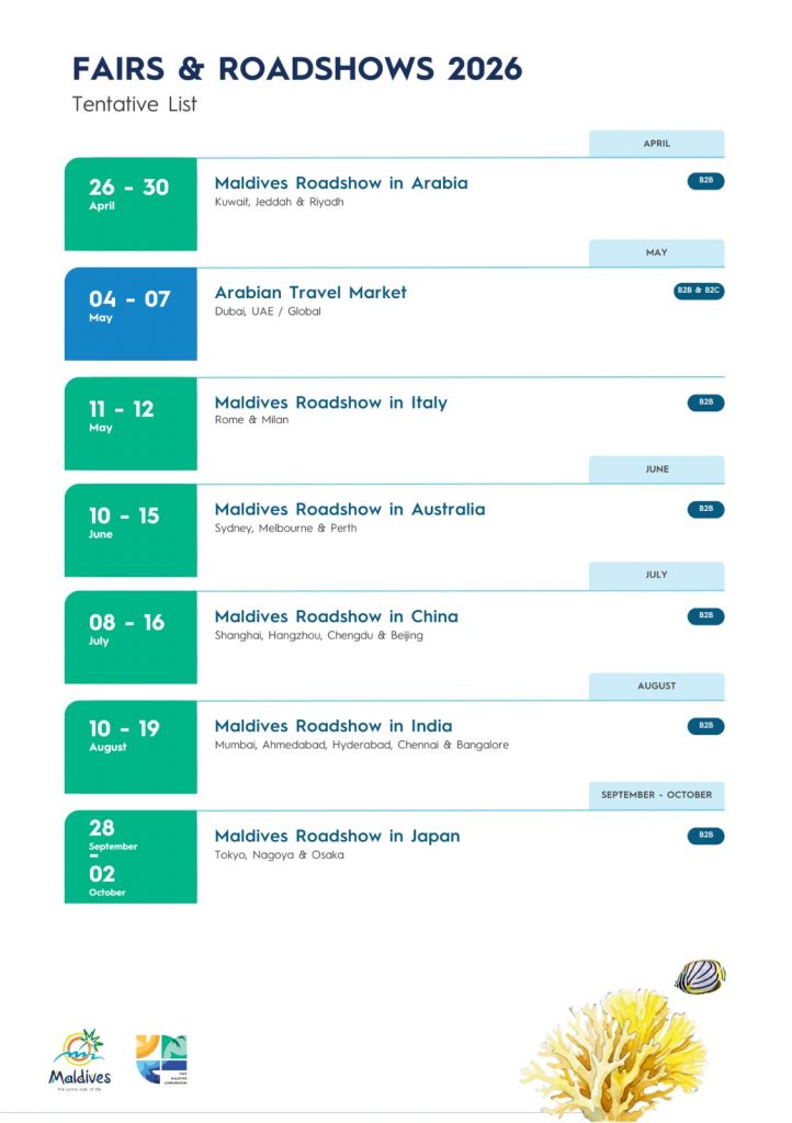 We are always on the road! Visit Maldives Corporation takes part in several fairs around the world every year. Below is a calendar of events planned for the year 2026.