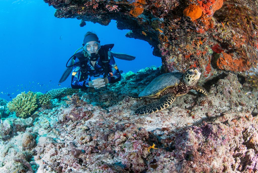 Hawksbill turtles are among the most consistently observed residents of Eri’s house reef. To date, 14 individual turtles have been identified by the resident dive team, eachrecognised by distinctive shell patterns, markings and physical traits. Familiar faces includeRosie, Cara and Anna, each recognised by their distinctive shell markings, from patterned carapaces to pale scutes and barnacle-speckled shells. Moving along their usual coral routes, these turtles have become part of Eri’s house reef community, named and logged through repeated sightings, and offering returning divers the chance to recognise and befriend them over time. Eri also invites guests to take part in this ongoing effort, where they will be given the chance to name any new turtle they discover that hasn’t been documented previously.