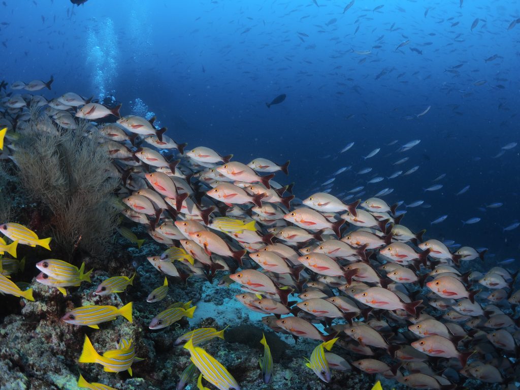 Each year from December through to April, manta rays are known to frequent the cleaning stations at Bodu Hithi Thila, located approximately one hour from Eri by boat. During this seasonal window, nutrient-rich currents and plankton flows draw mantas to the area, where they may be observed feeding near the surface or circling slowly through established cleaning stations. This is prime period that offers the most favourable conditions for witnessing these graceful visitors as part of the wider marine activity of the atoll.