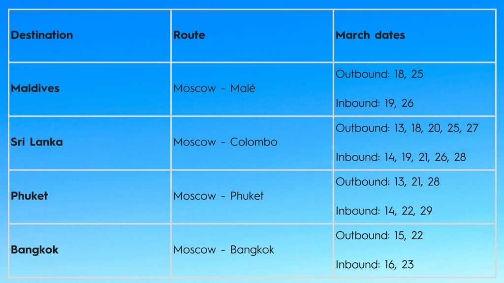 Aeroflot will launch additional flights in March between Moscow and Bangkok, Phuket, Malé, and Colombo in response to increased tourist demand and to expand travel options for passenger whose flights with foreign airlines were cancelled due to the unstable situation in the Middle East.