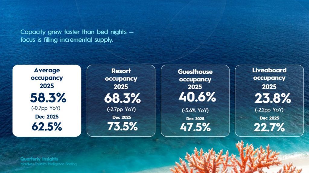 The Supply-Demand Dynamic: In 2025, Maldives recorded 13.67 million bed nights (↑ 2.4%). However, average beds in operation increased to 64,377 (↑ 4.3%).