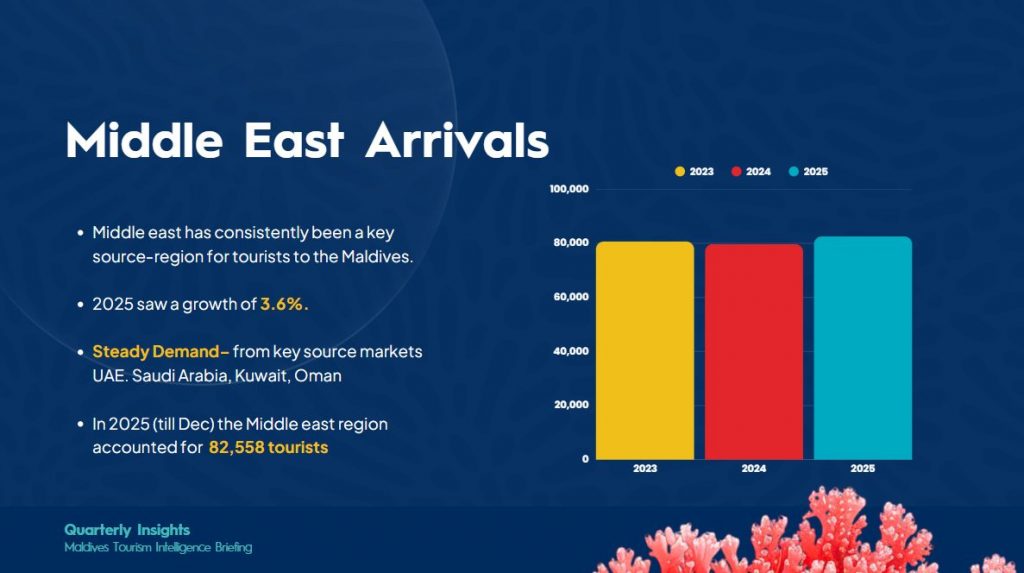 The Middle East continues to be a high-value corridor for the Maldives, characterized by a preference for premium hospitality and geographic proximity. In 2025, the region grew by 3.6%, delivering 82,558 arrivals by year-end. While the volume is smaller than Europe, the “quality of business” is exceptionally high. These travelers often arrive in large family groups, stay longer, and invest heavily in premium services such as private yachts, villa upgrades, and exclusive wellness activities.