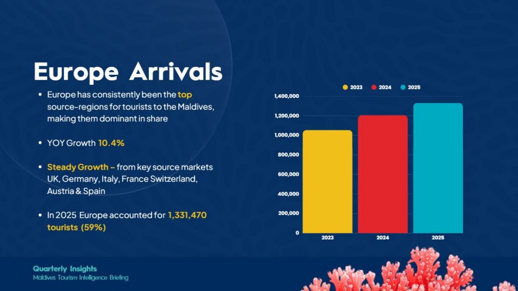 Reflecting on recent performance, Europe continues to be the primary anchor for arrivals, holding a dominant 59% share of the total market. In 2025, the region delivered over 1.33 million tourists, a testament to its enduring connection to the Maldives. This represents a strong 10.4% year-on-year growth, fueled by steady contributions from a broad base of major markets including Russia, the UK, Germany, Italy, and France. These numbers underscore that Europe isn’t just a volume market; it is the essential foundation for our industry’s stability.